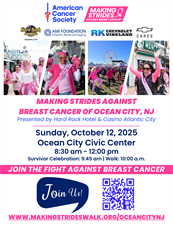 Our Making Strides of Ocean City Presented by Hard Rock Hotel & Casino will be Sunday, October 12th from 8:30 am until 12:00 pm at Ocean City Civic Center and Boardwalk.